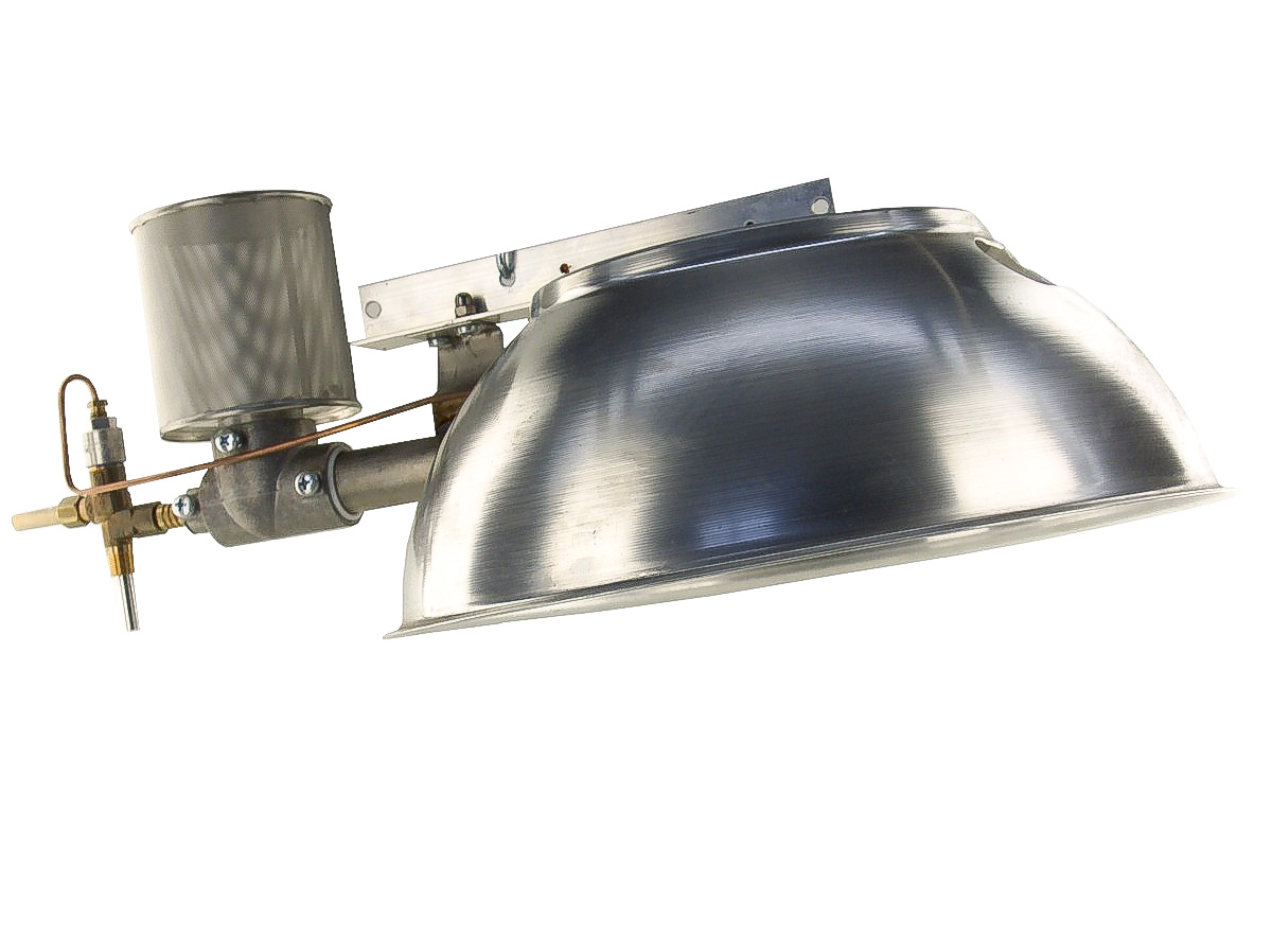 Tieraufzuchtstrahler für Erd- und Flüssiggas mit Streckmetallbrenner aus einer speziellen Chrom-Nickel-Legierung sowie Parabol-Reflektor aus Edelstahl.